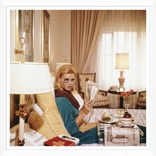 "Monocled Miss," captured by Slim Aarons in 1964 at the opulent Regency Hotel in New York, whispers of whimsical luxury in mid-century style. This captivating photograph features German model Renata Boeck indulging in breakfast in bed, her monocle perched with playful poise as she savors the morning amid plush linens and a tray laden with delights, bathed in gentle natural light. The scene embodies the essence of 1960s elegance, weaving eccentric charm with serene sophistication, evoking an enduring romance that enchants lovers of vintage allure and refined indulgence. Slim Aarons (1916–2006), born George Allen Aarons, rose from humble origins and World War II combat photography to become a celebrated chronicler of the elite, vowing post-war to photograph only "attractive people doing attractive things in attractive places," with his works gracing magazines like Town & Country and now preserved in the Getty Images archive. This exquisite reproduction from Soicher Marin is printed on premium luster photo paper using state-of-the-art techniques, ensuring vibrant colors, sharp details, and enduring quality that brings a touch of mid-century sophistication to any space.