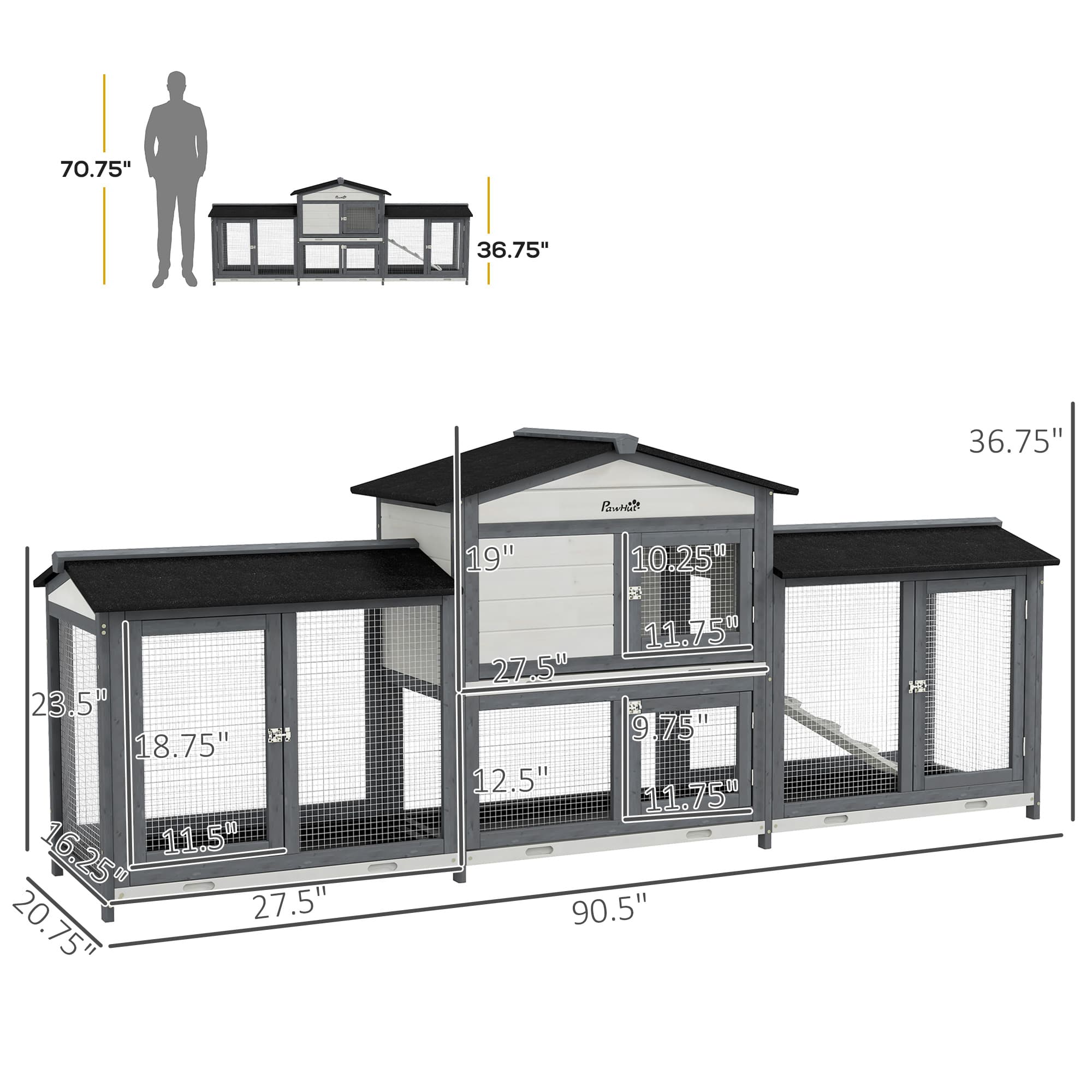 PawHut 90.5" Wooden Rabbit Hutch Bunny Cage Pet Playpen House Enclosure with Double Side Run Boxes, for Guinea Pig and Small Animals, Light Grey