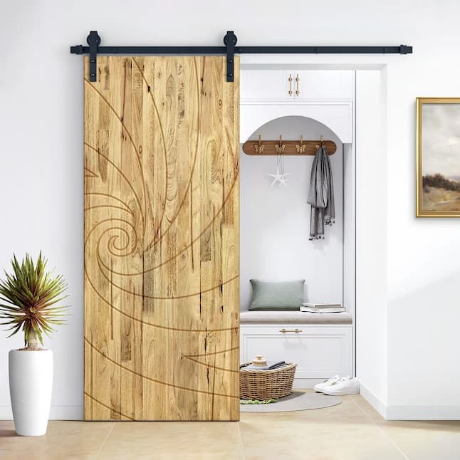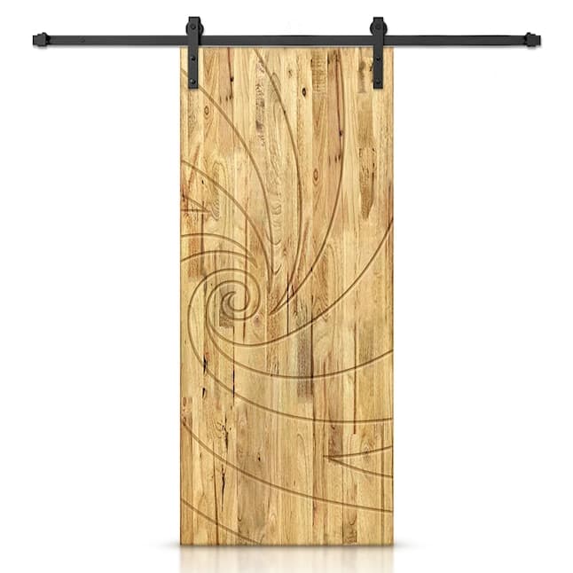 Fully assembled series barn door designed to save time with included CALHOME sliding rail hardware and exposed rollers. Made of eco-friendly, sustainable finger-joint pine with a fade-resistant, multi-step stain and seal finish. Set includes 1 pre-assembled door and 1 sliding hardware set (all bolts match finish). Ideal for closets, bathrooms, pantries, laundry rooms, bedrooms, kitchens, offices and more. Engineered wheel/bearing for smooth operation. Single-sided pattern with matching color on reverse; hardware constructed of powder-coated steel.