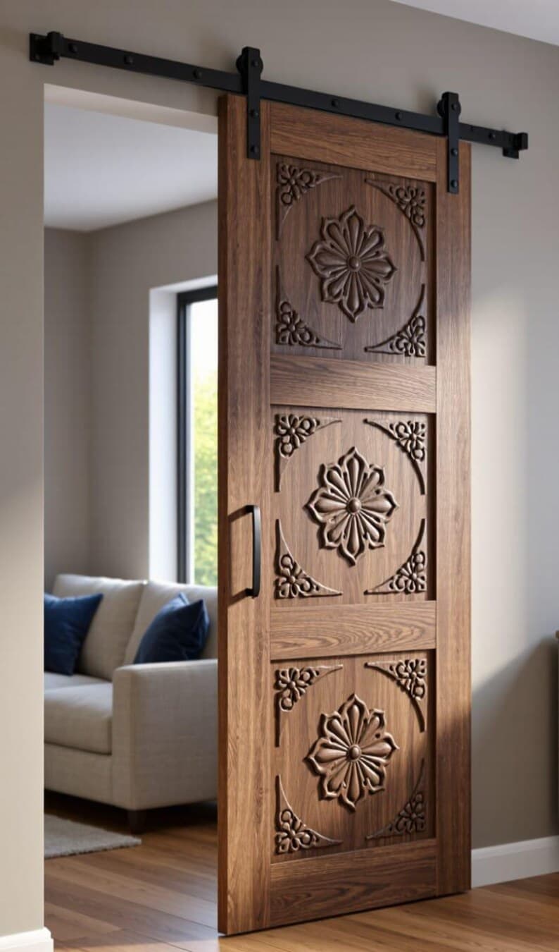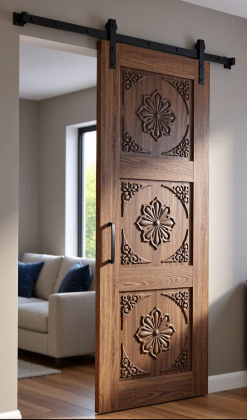 Enhance your interiors with this handcrafted wooden sliding door, designed with three bold sunburst medallions framed in intricate floral detailing. The natural wood finish and iron accents give it a rustic yet elegant look, perfect for farmhouse, bohemian, or eclectic interiors.