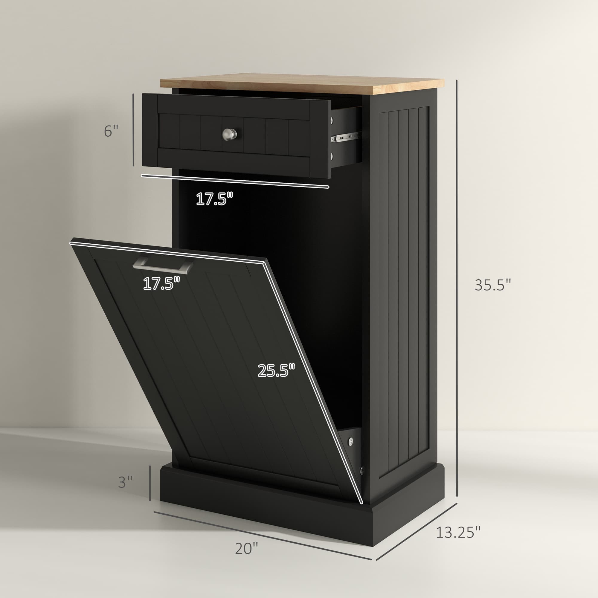 Our trash bin cabinet helps make your home tidier. With ample capacity, it's perfect for kitchen waste. The tipping waste container provides convenience when disposing of trash with hands full. This organizer is versatile, functioning either as a concealed dustbin or an island. The cabinet includes a dustbin with an oak wooden grain table top, adding a decorative touch to your home. Simplify meal prep with this HOMCOM trash can storage cabinet.