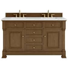 James Martin Vanities Brookfield 60" Double Bathroom Vanity in Honey Oak with 3 cm Ethereal Noctis Quartz Top and Rectangular Sinks