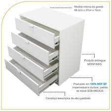 Nossa cômoda é fabricada em estrutura 100% MDF BP, que oferece durabilidade e resistência e conta com um excelente acabamento. Seguimos um padrão altíssimo de qualidade, assim podemos oferecer total garantia de nossos produtos! Material: 100% MDF BP (fórmica impermeável) de 15mm. Ferragens de qualidade. Puxador em perfil de alumínio. Embalagem em caixa de papelão duplo reforçada. Conteúdo: cômoda com gavetas + puxadores. Aplicação: quarto ou sala. Produto entregue montado. Fotos reais do produto. Somos fabricantes.