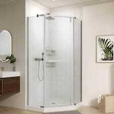 Neo-angle pivot semi-frameless corner shower enclosure with chrome finish. Designed for a 36 in. wide opening and 72 in. tall installation; pivot door and semi-frameless glass design.