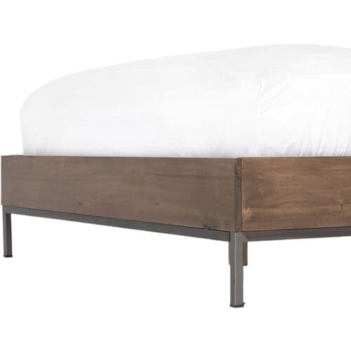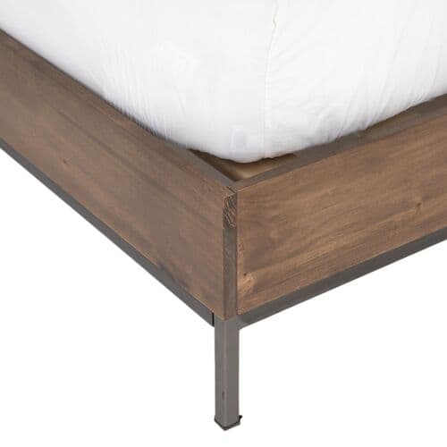 The bed's clean lines and flat surfaces highlight the rich grain of poplar wood beautifully. Iron legs and base add a neat, tailored look to the design.