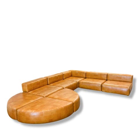Mid century modern hard to find 8 piece sectional sofa by the Harvey Probber “Cubo” line. Stunning original camel colored patchwork leather. Stamped underneath. These sofas typically sell in the $30,000 range.