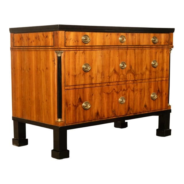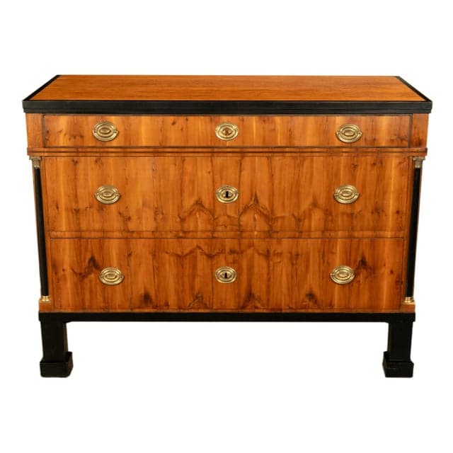 A fine antique Austrian early Biedermeier walnut & ebonized chest of drawers/commode, circa 1820. This very handsome antique Biedermeier commode is in excellent condition; made from blond walnut with elegantly figured grain, the top having an ebonized band. It has three drawers each with the original gilt-brass handles & lock escutcheons, flanked by a pair of ebonized columns mounted with gilt-bronze Corinthian capitals & plinths. Raised on an ebonized skirt with four ebonized legs with block feet. Drawer linings & back panels are white pine. The finish was recently refreshed in the seller's professional workshops; condition noted as very good antique condition.