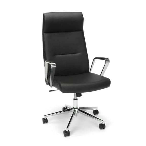 Premium bonded leather executive chair with integrated headrest, contoured lumbar zone, fixed padded polished-aluminum arms, premium foam seat padding, pneumatic height adjustment, swivel-tilt and 360-degree swivel on a chromed welded steel five-star base with 60mm casters. Weight capacity: 275 lbs.