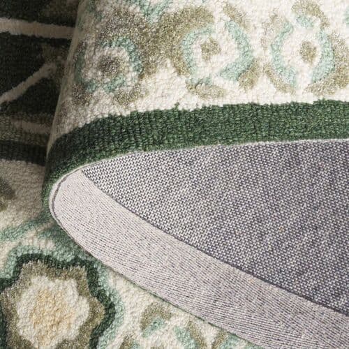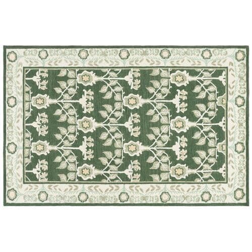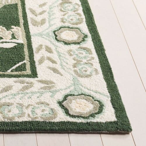 Transform your living space with the timeless elegance of our 4-foot by 6-foot small rectangle area rug. This exquisite piece boasts a lush green and ivory color palette, exuding sophistication and a calming ambiance. The transitional style seamlessly bridges the gap between traditional and contemporary design, making it an ideal addition to any decor. Crafted in India using a meticulous hand-tufted technique, this rug showcases outstanding craftsmanship and attention to detail. The comforting 1/2 inch pile height invites you to sink your toes into its luxurious blend of materials, featuring 65% wool for warmth, 20% cotton for a soft touch, and 15% viscose for a subtle sheen, creating a rich texture that is as pleasing to the touch as it is to the eye. This rug's enchanting pattern, inspired by the image, captures the essence of botanical charm with its stylized floral motif. Framed by an intricate border, the harmonious arrangement of the flowers and leaves infuses your room with natural serenity and an enduring aesthetic. Integrate this hand-tufted treasure into your home and enjoy a masterpiece that balances comfort, durability, and artful design.
