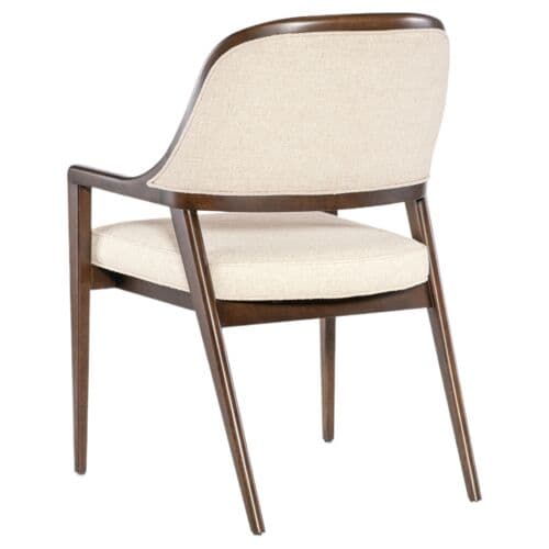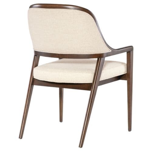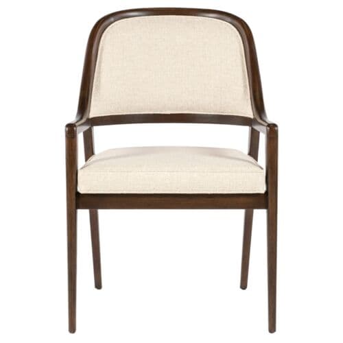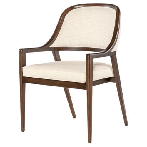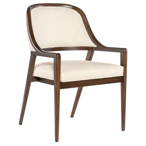 The Archives Upholstered Arm Chair brings structured elegance to your dining room. Upholstered in performance fabric, this chair combines a traditional barrel-back design with a luxurious finish on the wood frame. The plush fabric seat and welt trim details make this chair a comfortable and stylish option for formal dining settings. It is ideal for creating a cohesive, elegant dining room look.