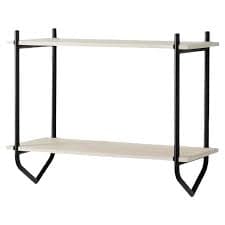 In French, the name of this wall shelf means on top of and describes its primary function — to store your books, tableware, or decoration on top of the shelves. Dessus is a double-deck wall shelf. Powder-painted metal and plywood here accompany each other and connect into a timeless piece. Moreover, this shelf comes in a flatpack. Its two arch metal frames and two birch plywood shelves are easy to assemble and fix on the wall. Finally, the shelf is available in two classic colors — off white or coal black frame.