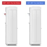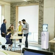 Load 5 gallon bottles with this electric Primo home water dispenser. Features a sleek white finish, low-noise compressor cooler, hot-water child safety lock, digital screen with status indicator, fits 2 to 5 gallon bottles, removable drip tray and storage cabinet. Cold water tank 3.2L (6–10°C), hot water tank 1L (88–95°C). Voltage 110V/60Hz. Weight 20.3 lb (9.21 kg).