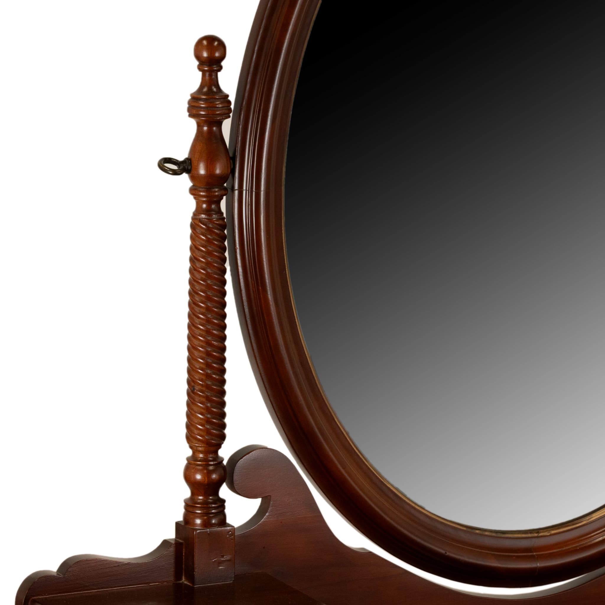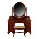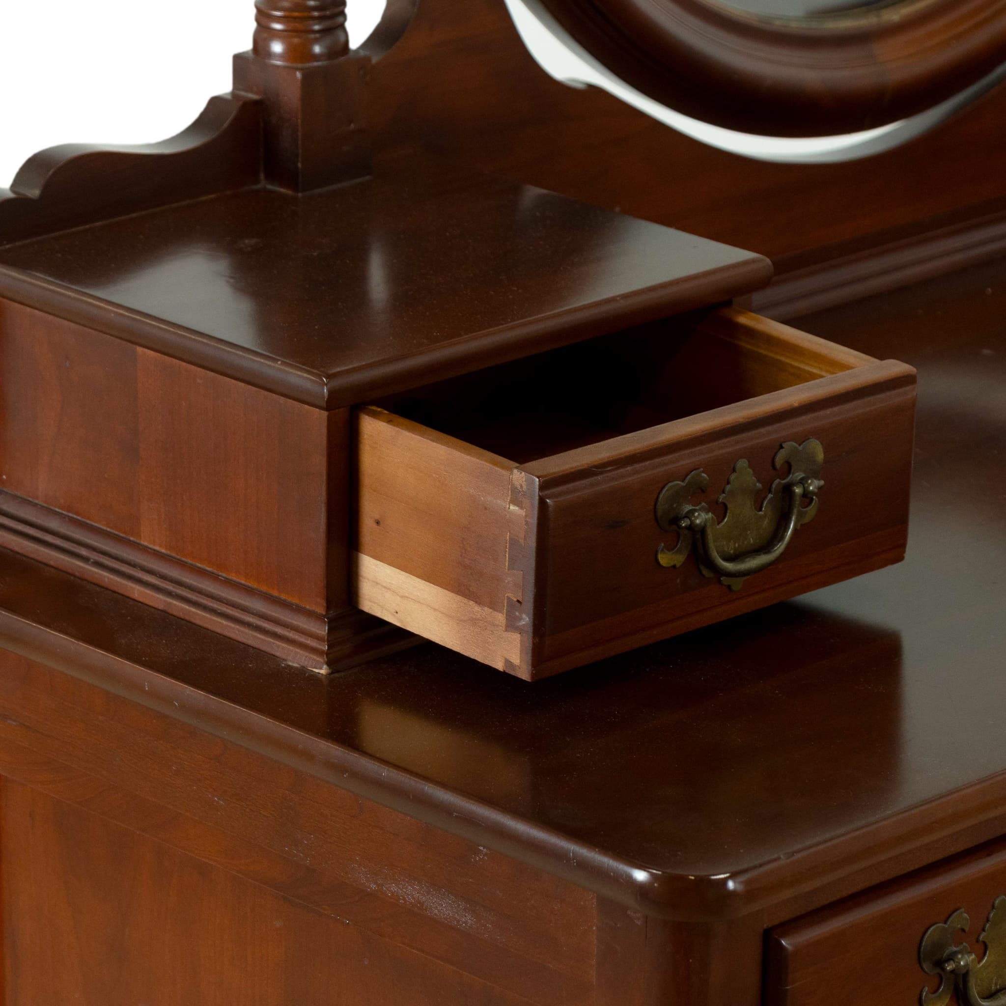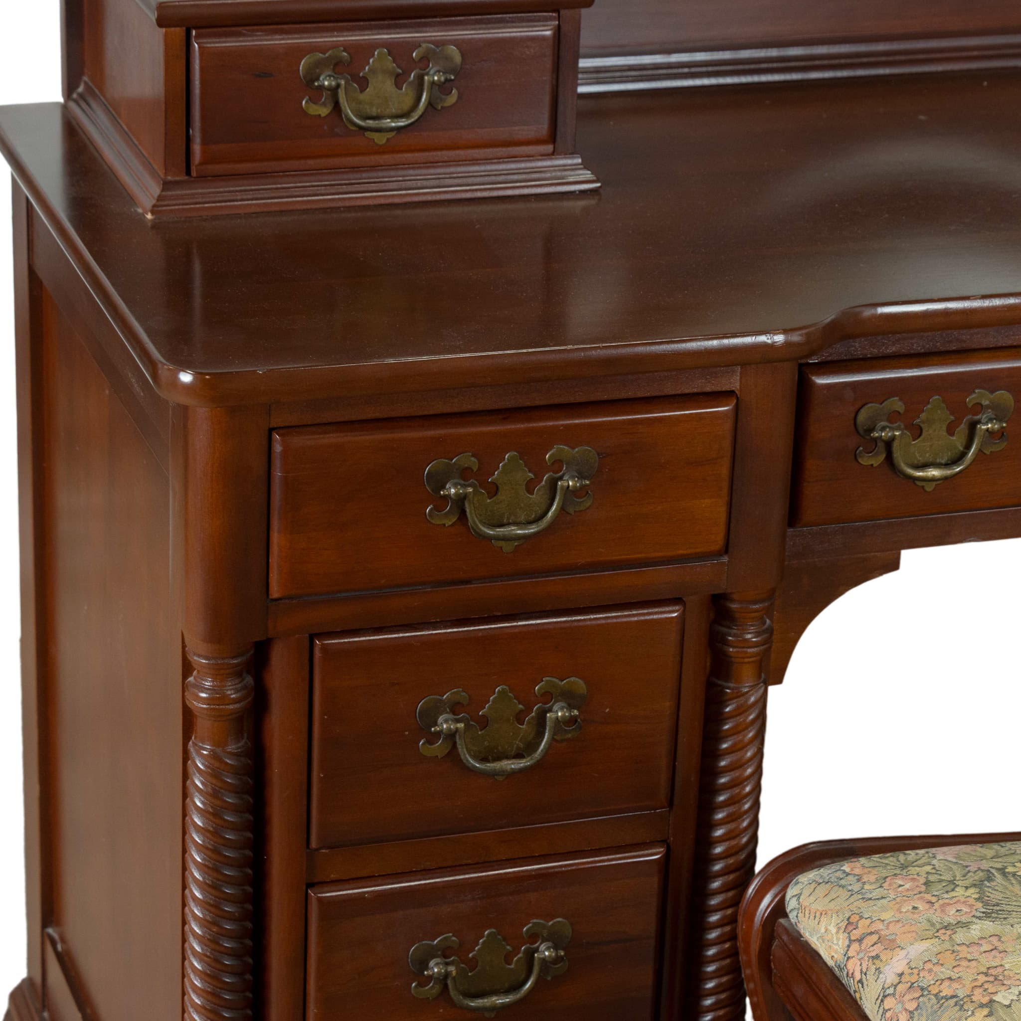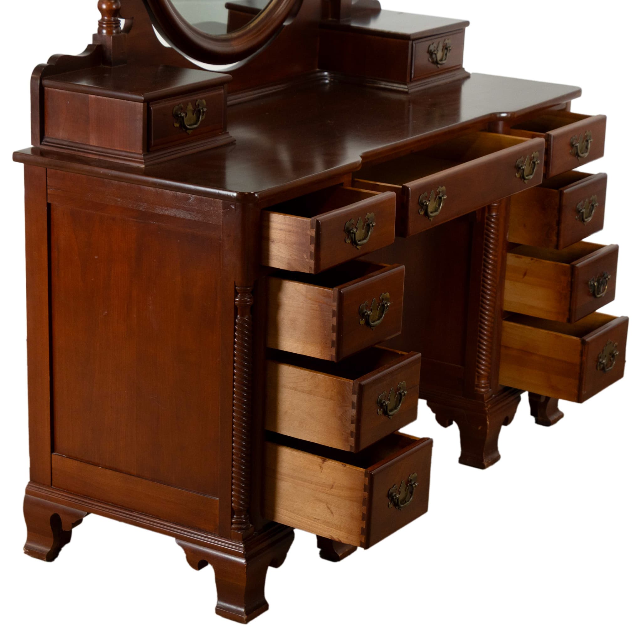 Vintage wild cherry vanity by Willet Furniture. Dark, red-toned finish wood frame with dark brass drop pulls throughout. Upper, oval framed mirror on spiral turned supports. Two upper drawers along a spacious top. Four drawers on both sides with spiral column details. Central dual pull drawer above the knee hole. Matching stool with curved legs and floral upholstery. Good AS IS condition with scratches, scuffs, and wear throughout. Sold / Out of stock.