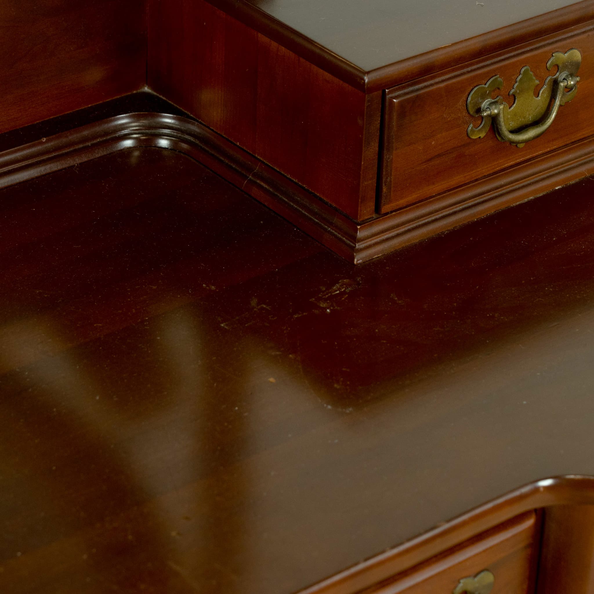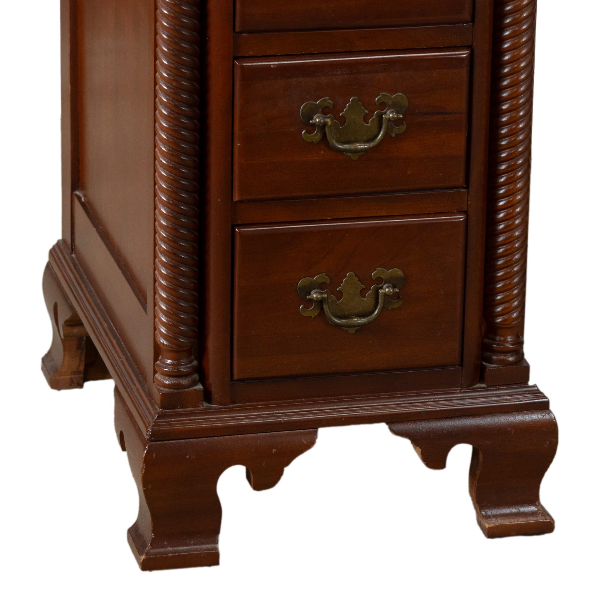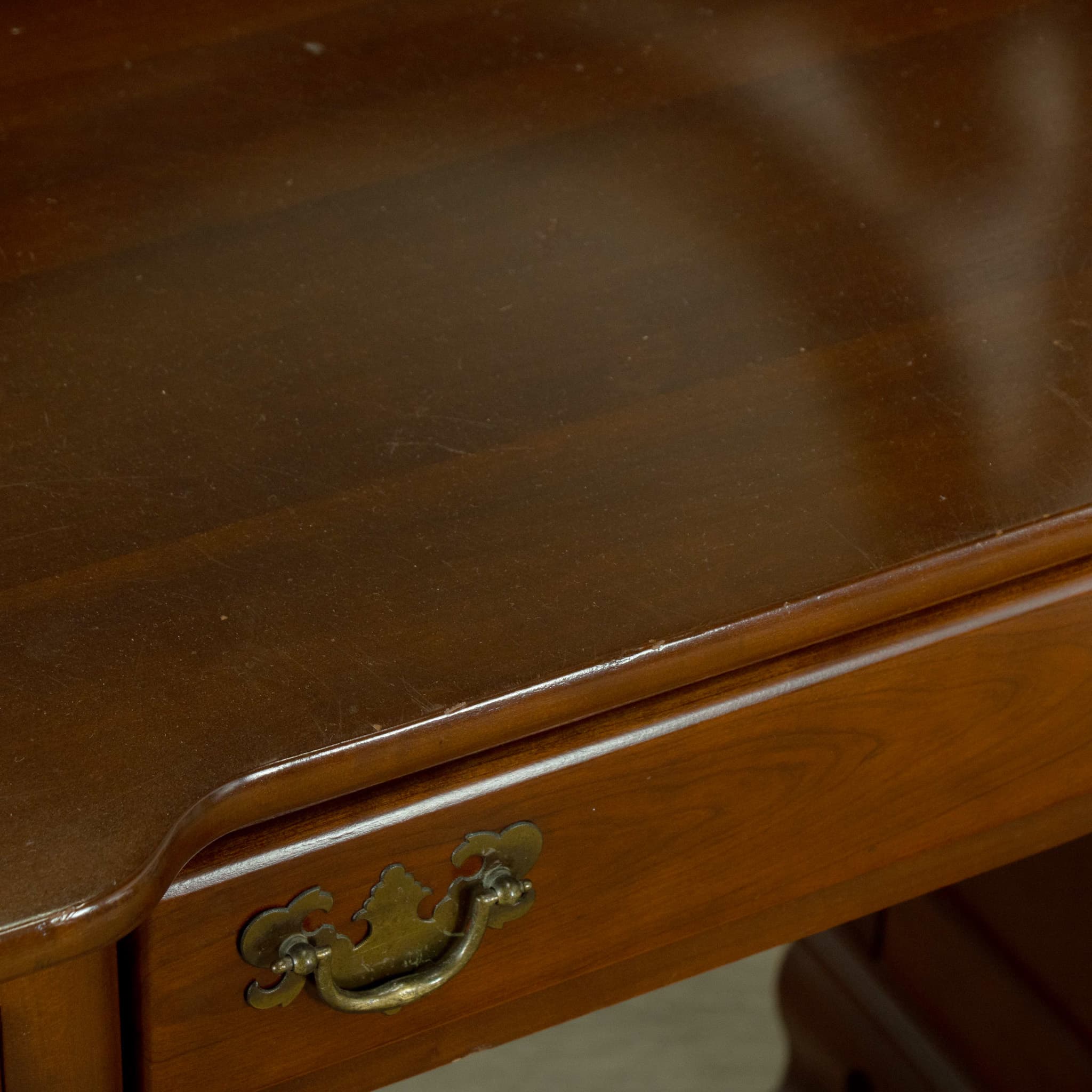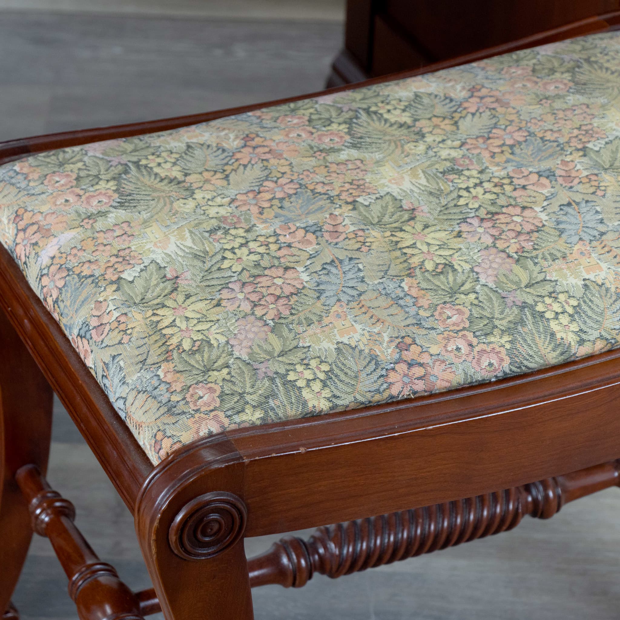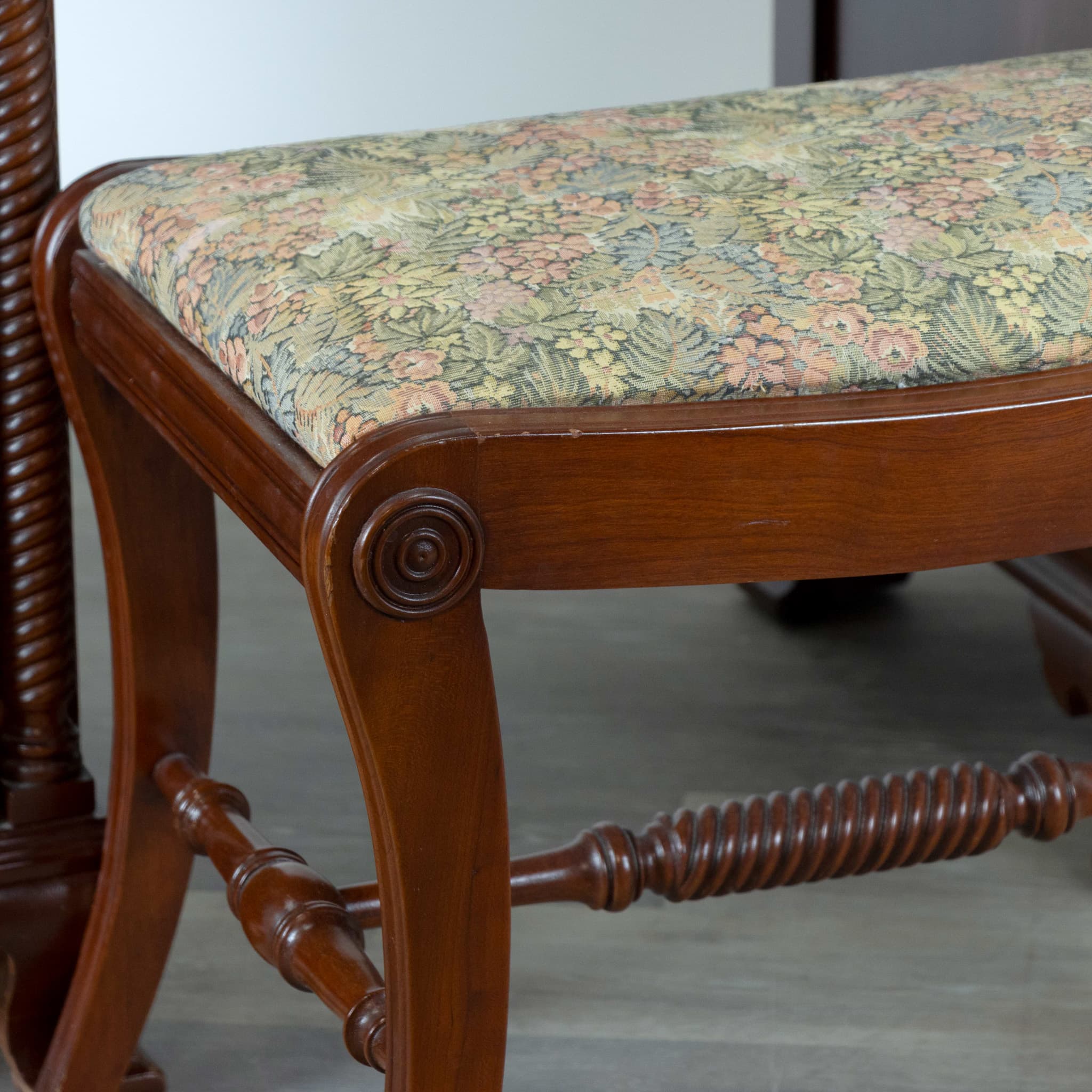 Vintage wild cherry vanity by Willet Furniture. Dark, red-toned finish wood frame with dark brass drop pulls throughout. Upper, oval framed mirror on spiral turned supports. Two upper drawers along a spacious top. Four drawers on both sides with spiral column details. Central dual pull drawer above the knee hole. Matching stool with curved legs and floral upholstery. Good AS IS condition with scratches, scuffs, and wear throughout. Sold / Out of stock.