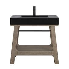 Console-style bathroom vanity in a Weathered Timber (Auburn) finish with a Black Matte mineral-composite countertop. Contemporary black matte finish offers a non-reflective, fingerprint-resistant surface and pairs with a variety of countertop and hardware choices.