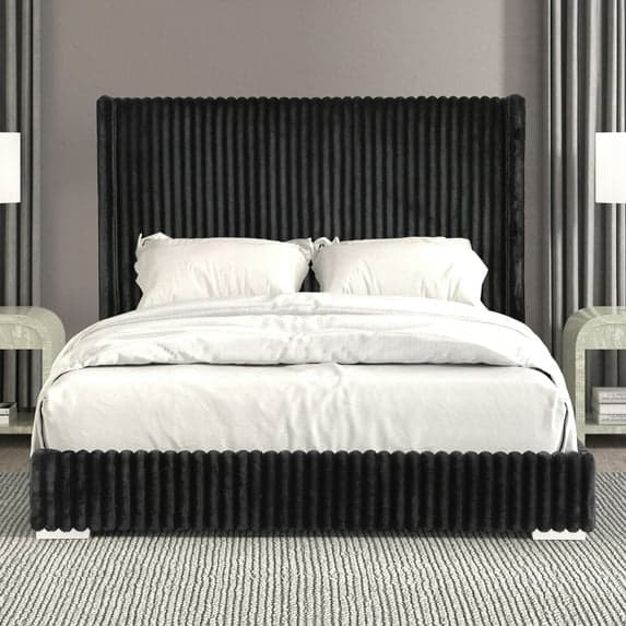 Elegant contemporary queen platform bed with an extra-tall tufted, padded wingback headboard upholstered in polyester chenille fabric; includes slat kit (mattress-ready) and supports up to 1000 lb. Overall dimensions: 65" W x 89" D x 68" H. Assembly required; ships in one box.