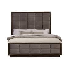 Glamorous and refined, this California king bed enhances the classic look of a master bedroom. Expertly crafted, it offers maximum support and durability. Its strong, stately silhouette is pleasingly offset by the smooth texture of soft fabric upholstery. Eye-catching, rectangular shapes adorn its base and headboard for a touch of appealing artistry. Its frame is finished in an elegant shade of smoked peppercorn to complete its elegant look.