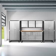 - Components (varies by finish/model): 2 x 36" W rolling storage cabinets (18" D x 72" H), 3 x 24" W wall storage cabinets (12" D x 24" H), 1 x 11-drawer rolling workbench (77" W x 20" D x 37.5" H)