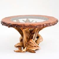 This exclusive Woodland Creek design is handcrafted from a redwood top with a twisted juniper branch base and an inlaid glass top to showcase the artistic base. The piece blends rustic, organic and modern elements; juniper is reclaimed from high-elevation areas and the base can be finished natural or in an urban graphite (gray wash). Custom sizes and options are available.