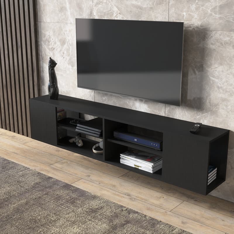 Bring sleek, modern style to your living room with the Rosita Floating TV Stand. Designed for TVs up to 80", this wall-mounted media console features a clean, low-profile silhouette with open shelving for décor and devices. Crafted in black, walnut and white wood finishes, it offers six open shelves and a floating, space-saving design ideal for contemporary spaces.