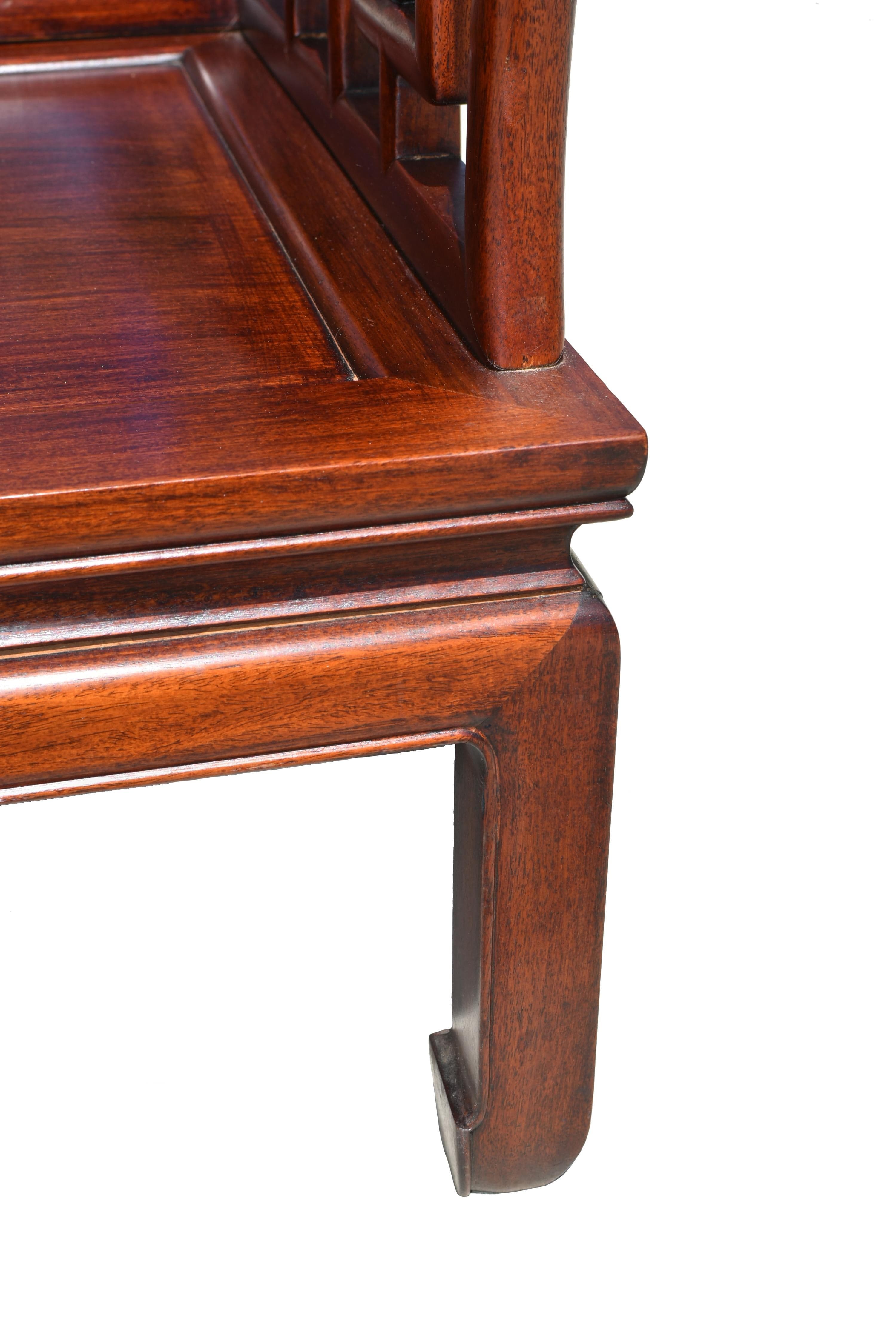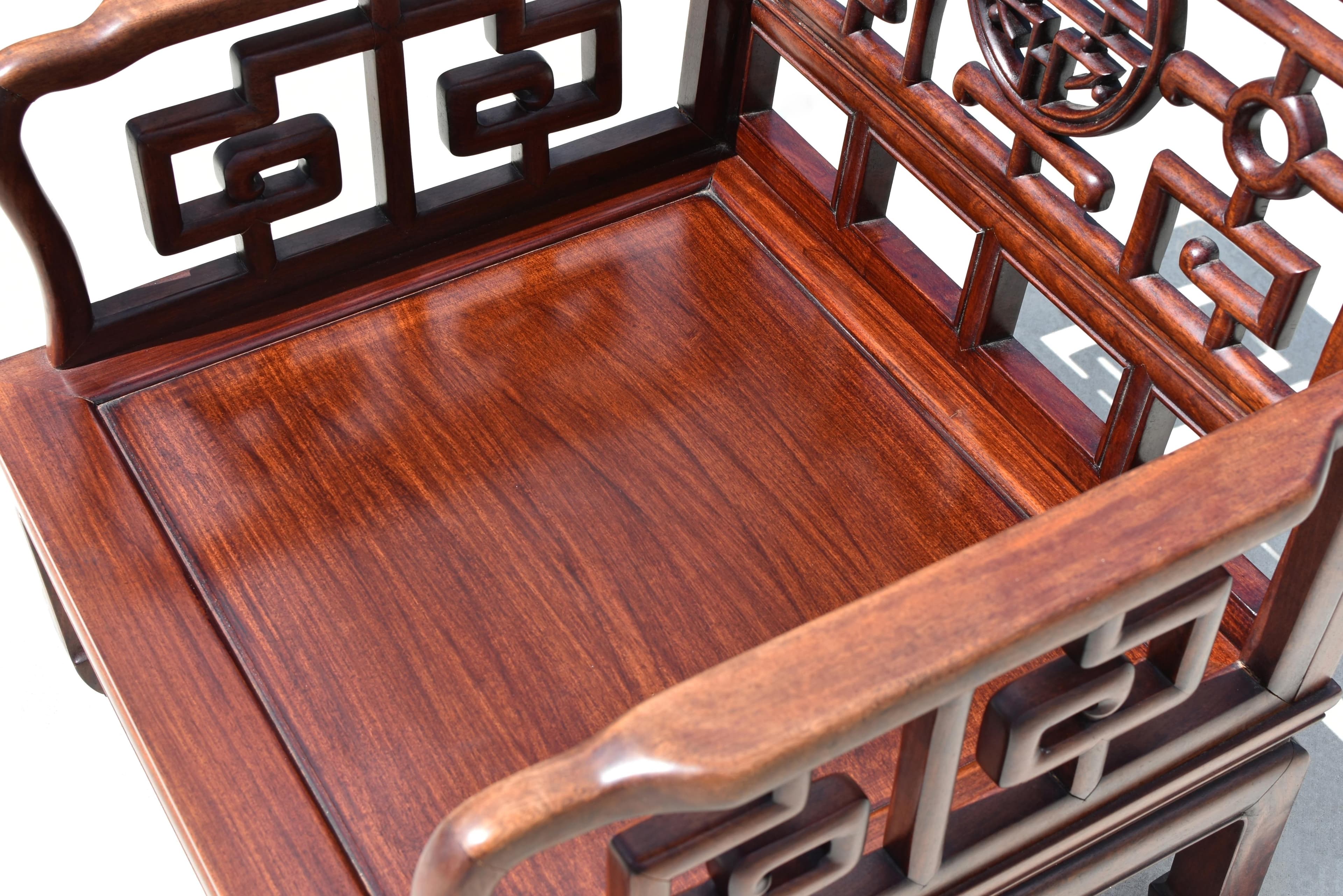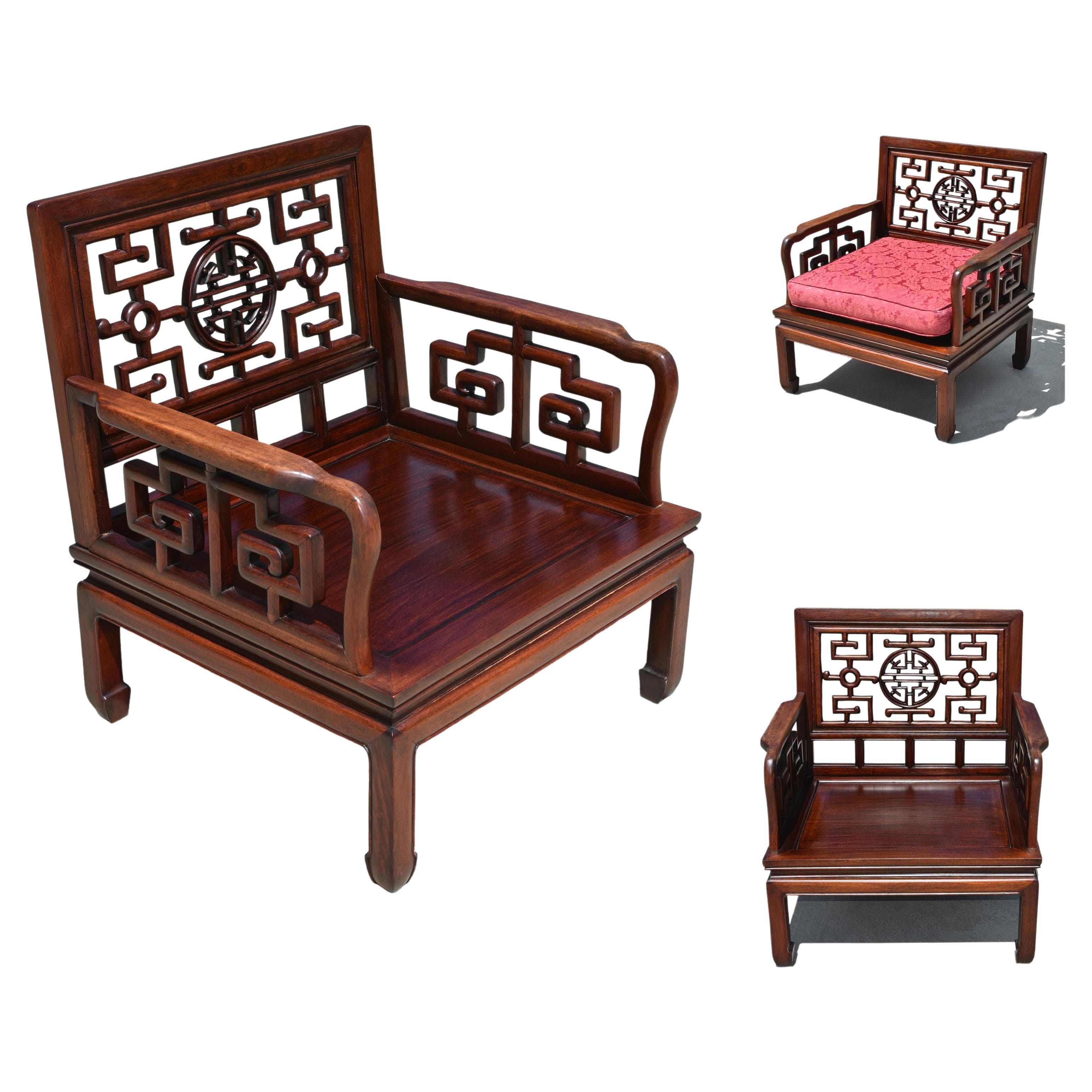 One beautiful solid rosewood meditation chair of the highest quality. Solid construction with tenons and mortises. Back splat finely carved with longevity motifs centered around the medallion of long life. Arms solid and comfortably contoured, with double scrollwork forming a Ruyi symbol. Extra deep and wide seat crafted with single board solid rosewood, set within the ingenious "floating panel" construction that ensures long term stability. Finely crafted waist, supported by four solid hoof-feet legs. Use of prized rosewood and Hua Li wood. In excellent condition. Listing is for 1 chair.