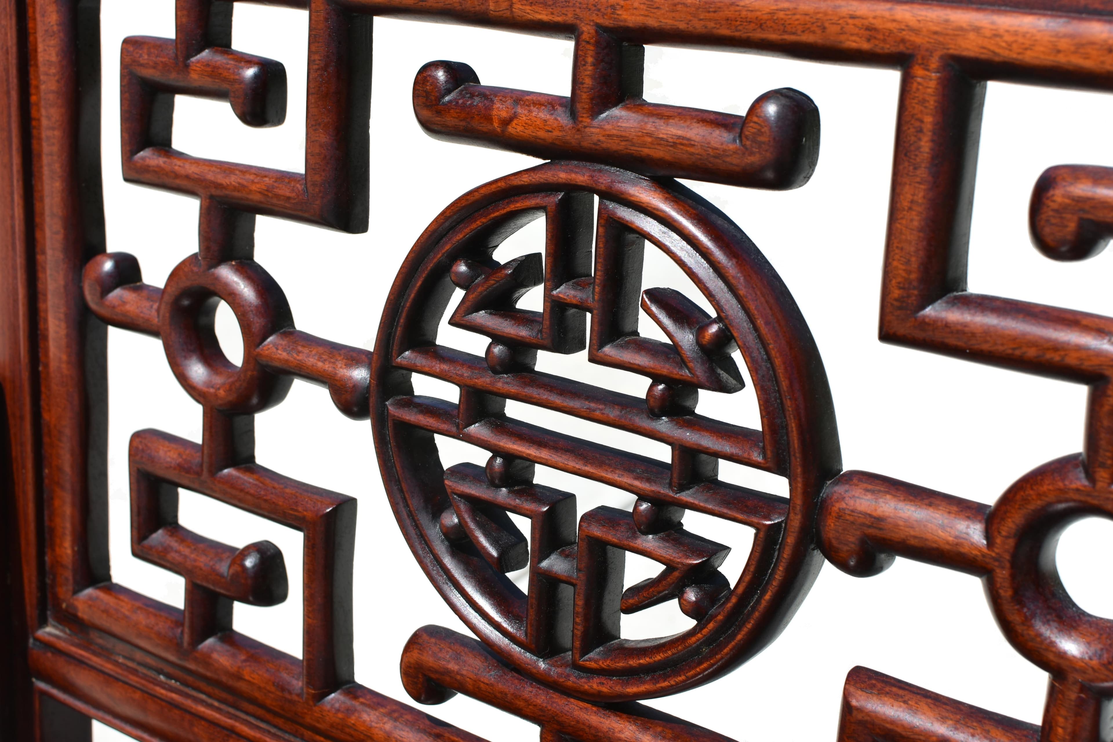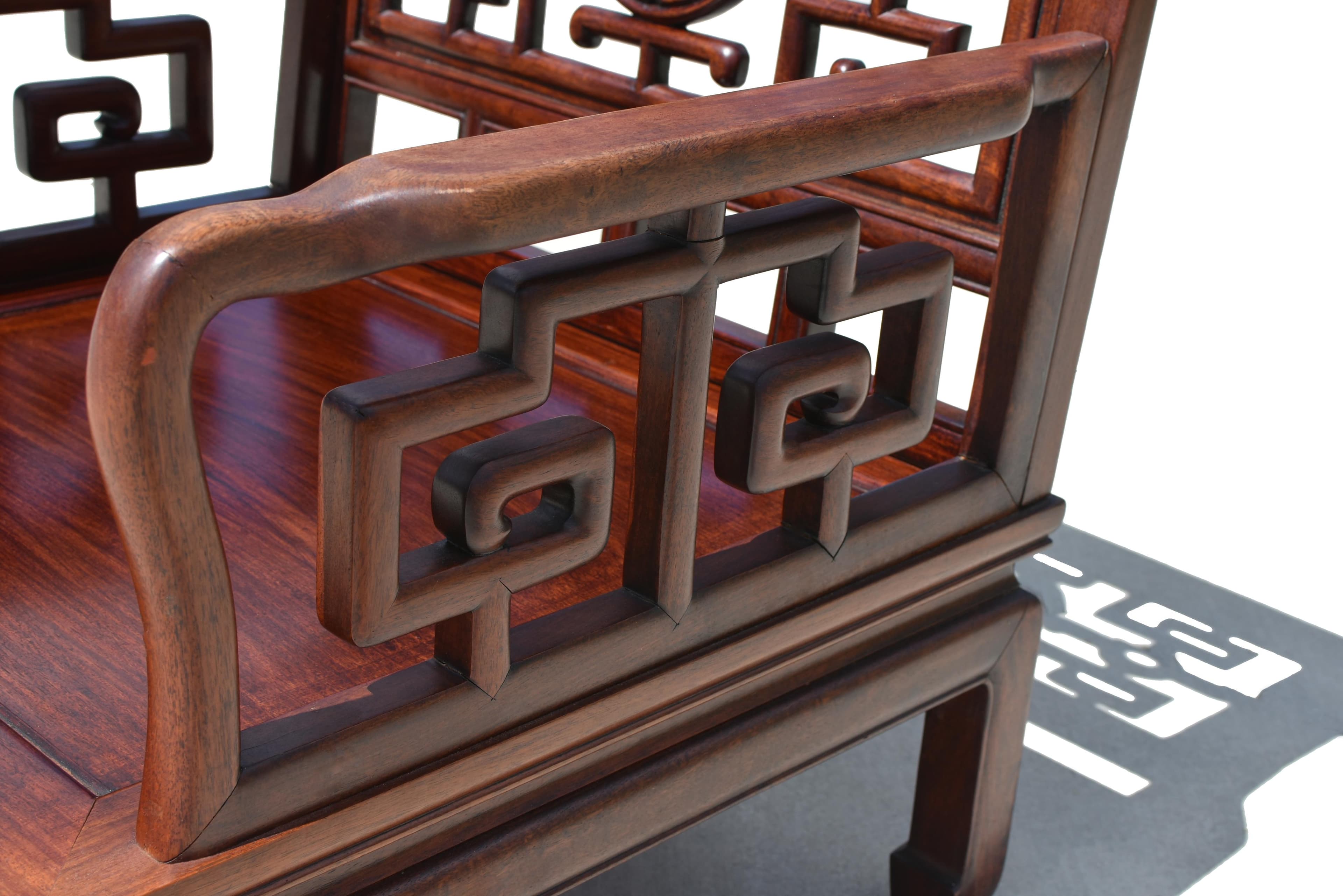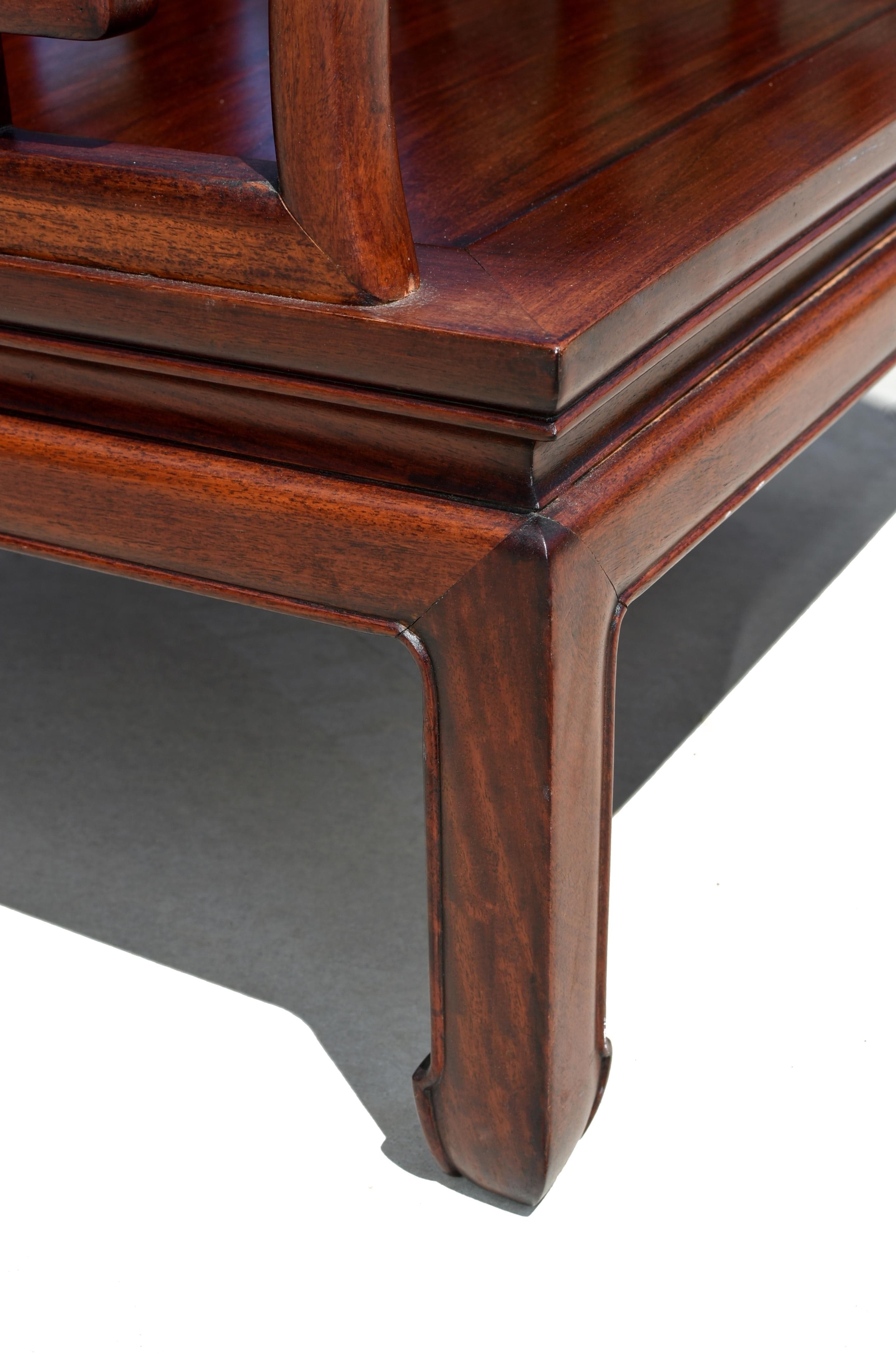 One beautiful solid rosewood meditation chair of the highest quality. Solid construction with tenons and mortises. Back splat finely carved with longevity motifs centered around the medallion of long life. Arms solid and comfortably contoured, with double scrollwork forming a Ruyi symbol. Extra deep and wide seat crafted with single board solid rosewood, set within the ingenious "floating panel" construction that ensures long term stability. Finely crafted waist, supported by four solid hoof-feet legs. Use of prized rosewood and Hua Li wood. In excellent condition. Listing is for 1 chair.