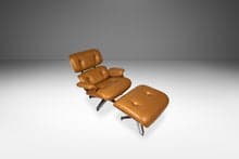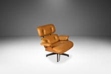 This authentic Eames Lounge Chair Model 670 and Ottoman Model 671 set, crafted in 2007, exemplifies timeless mid-century modern design with its luxurious original cognac leather upholstery and striking white oak finish. The chair’s iconic sculpted form, paired with the matching ottoman, offers unparalleled comfort and style, enhanced by a sleek white oak shelf. The leather shows tasteful patina and minor vintage wear; the wood shows minor nicks and pressure dings but no major damage. Signed, origin USA. Materials: Oak, Leather. Style: Mid-Century Modern | Asian Modern.