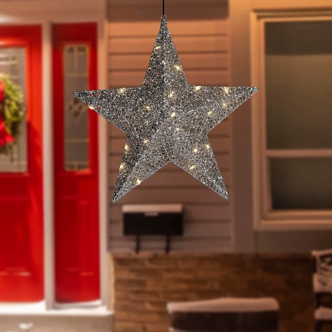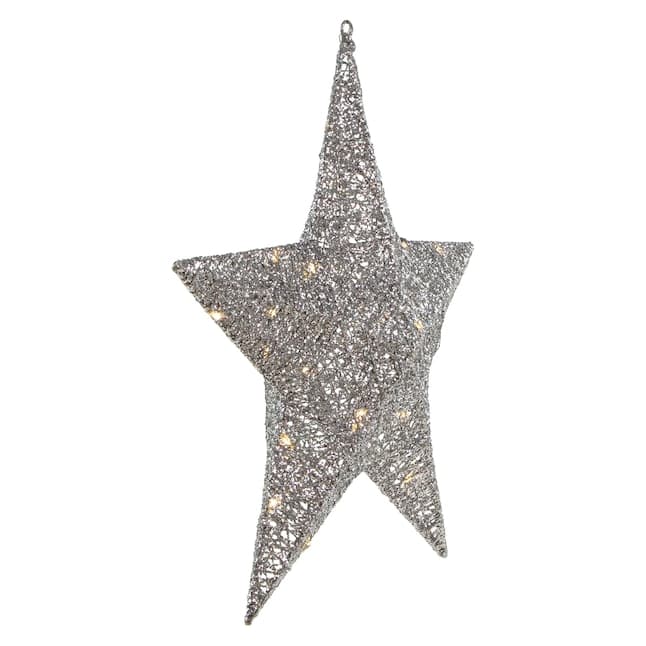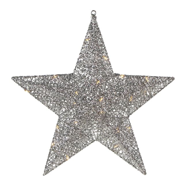 This hanging star is sure to light up your holiday decor! This 5-point star has the look of spun glass covered in sparkling silver glitter. The warm white LED lights provide a soft glow to your space. The loop at the top allows you to hang this star easily. Product Features: Pre-lit with 20 warm white lights; Bulb size: micro fairy; Bulb type: LED; 16' clear lead wire; LED lights use 90% less energy; Cool to the touch; Some easy assembly required; Ground stakes and cable ties included; UL approved and certified for indoor or outdoor use; Raintight class 2 power supply; Input: 120 volts, 60 hertz, 0.20 amps; Output: 4.5 volts, 0.80 amps. Materials: tinsel/metal/plastic.