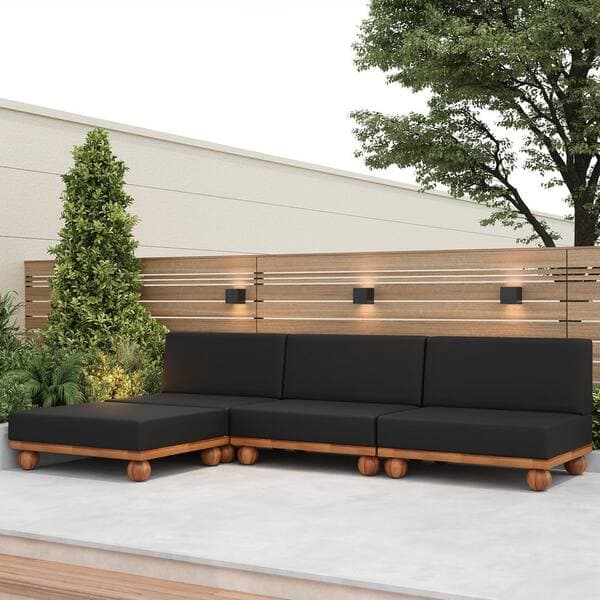 Steffi Modern 4-Piece Solid Wood L-Shape Outdoor Patio Sectional Sofa Set with Ottoman and Black Cushions, Round Legs
