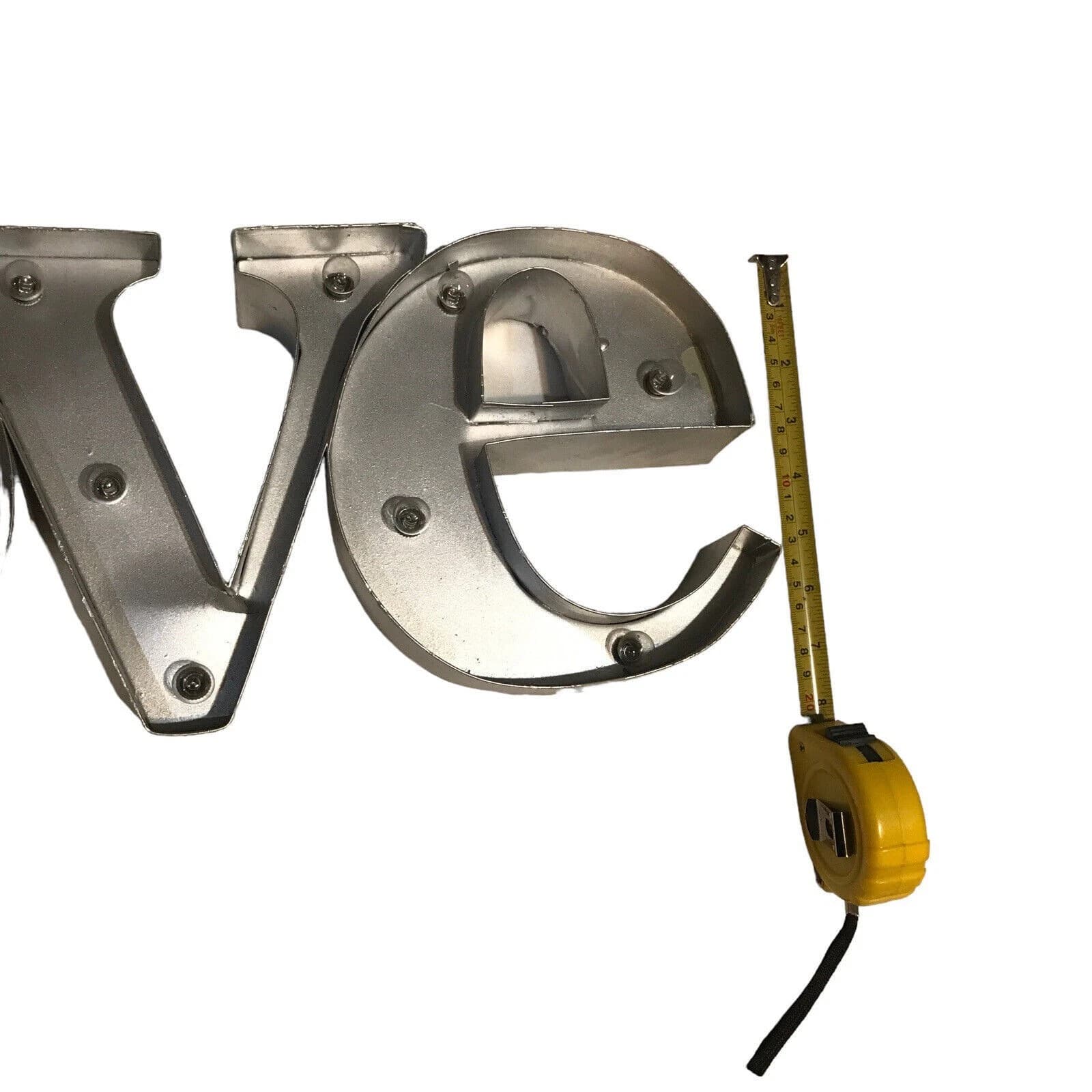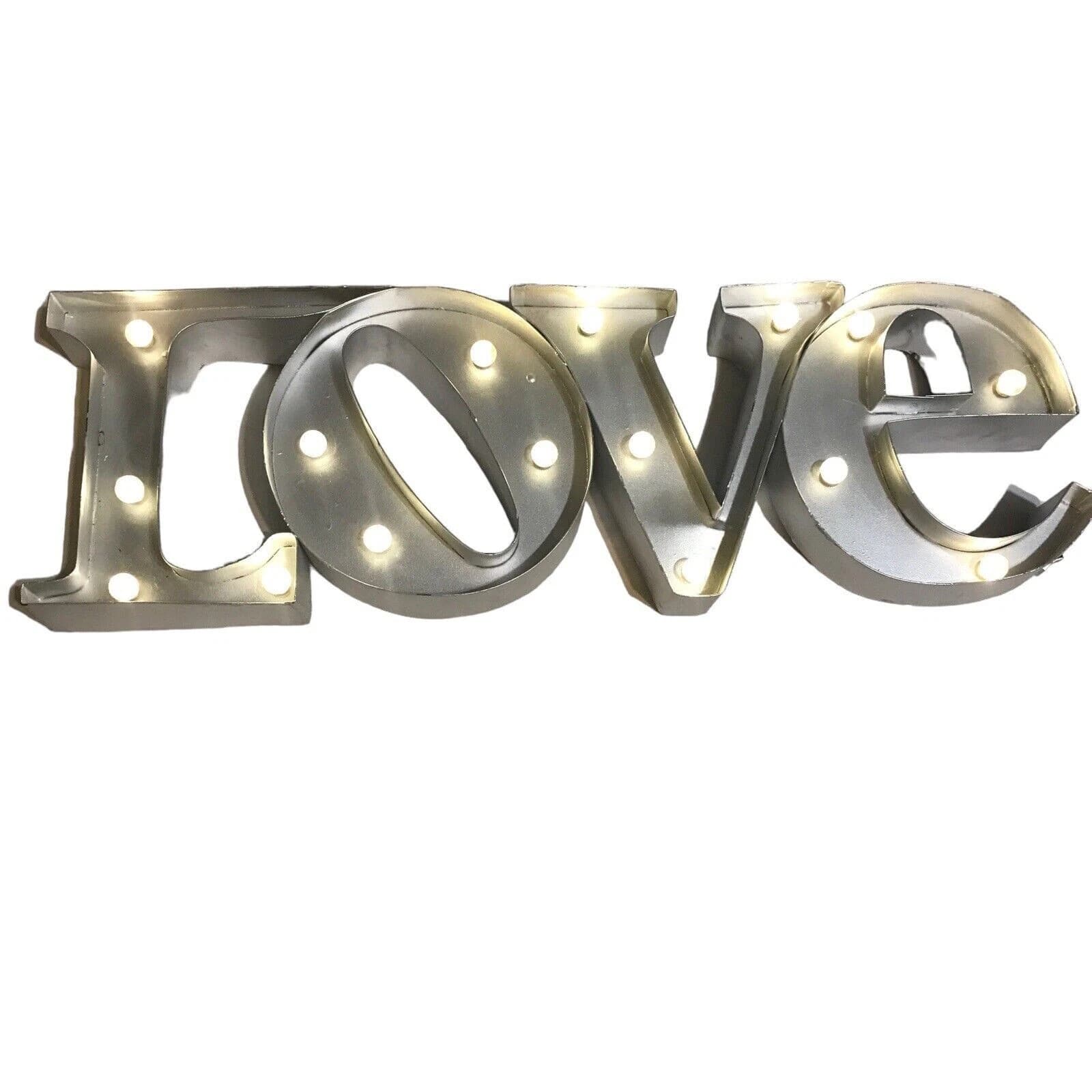 Seller notes: "Has some paint chip scuffs and one LED bulb is missing its plastic cover, Light works On/Off". Condition: Used. Listing: Lighted LOVE metal marquee sign, battery-operated LED bulbs.