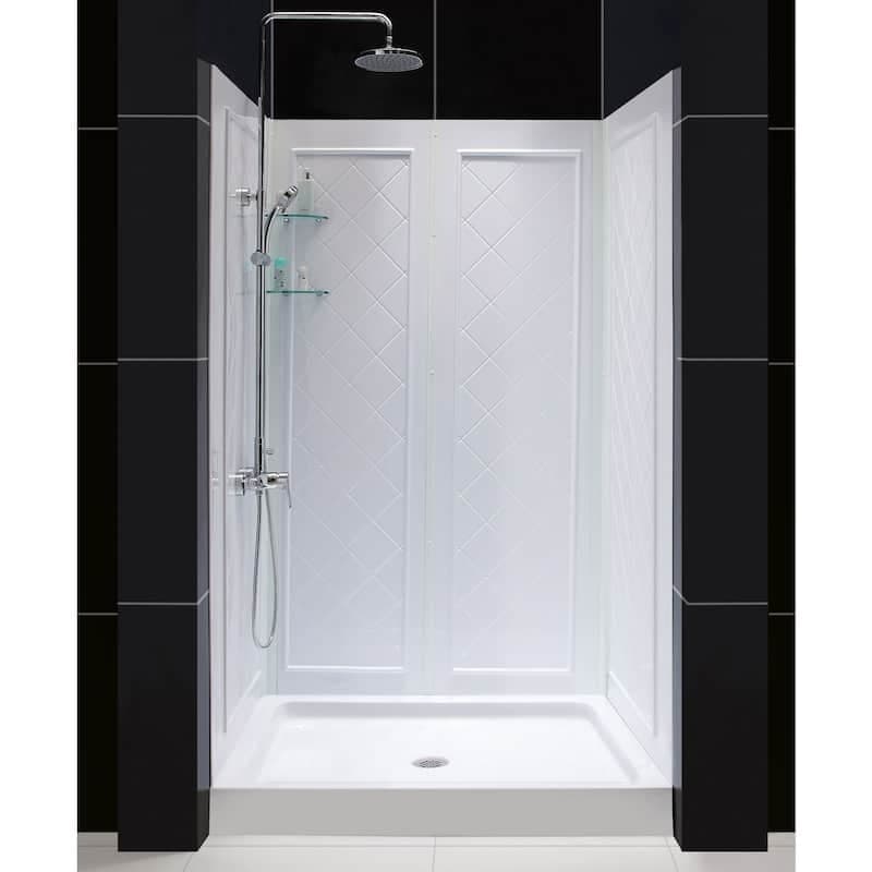A DreamLine kit that pairs a low-profile SlimLine single-threshold shower base with QWall-5 acrylic/ABS backwall panels in a white glossy finish. The base features a slip-resistant floor, integrated tile flange, center drain location, and fiberglass reinforcement. The backwalls have a tile-pattern texture, two glass shelves, and trim-to-size panels for easier installation. Professional installation is recommended; base has a limited lifetime warranty and backwalls have a one-year limited warranty.