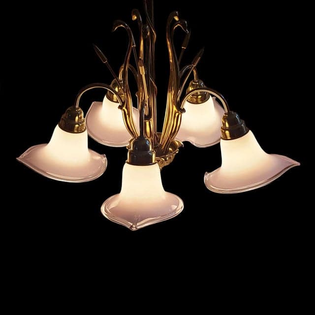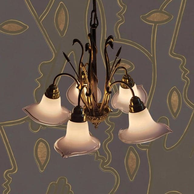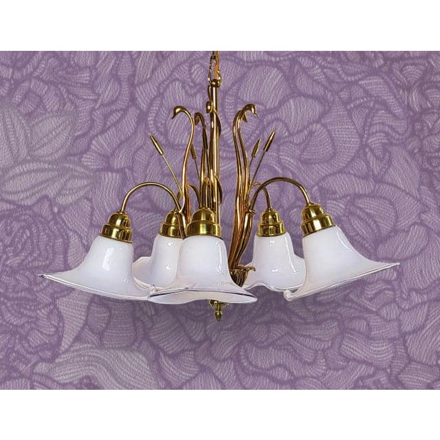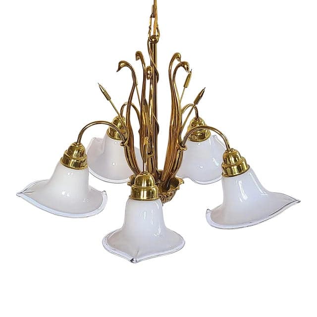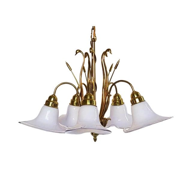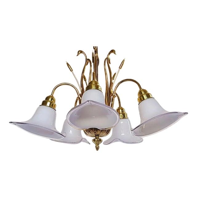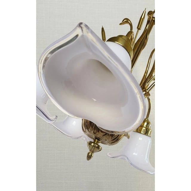 Mid 20th Century Art Deco Brass Swans & Cattails Murano Calla Lily Chandelier Attributed to Franco Luce