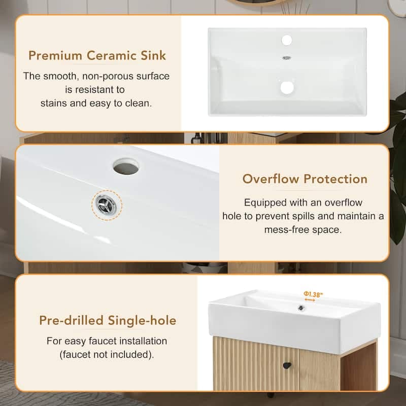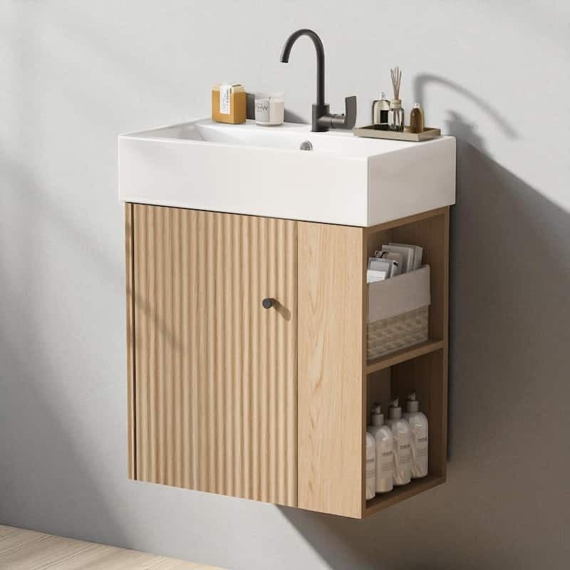 Perfect for compact bathrooms, this 21.6" modern wall-mounted vanity combines stylish design and space-saving functionality. With a floating installation, durable ceramic basin, and right-side storage, this vanity offers an ideal upgrade for efficient and contemporary bathroom layouts. Features include a wave-textured door, rose gold handle, soft-close hinge, built-in overflow in the ceramic sink, and a pre-drilled single faucet hole. Mounting hardware and instructions are included. Faucet not included.