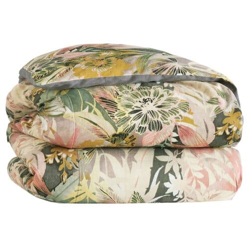 This comforter features a vibrant botanical print that brings a touch of natural elegance to your bedroom. Reversing to Breeze Slate in 100% linen, it offers both visual contrast and breathable comfort. Lightly hand-tacked with a 1" loft poly batting, this piece delivers a plush, refined finish with subtle detailing throughout.