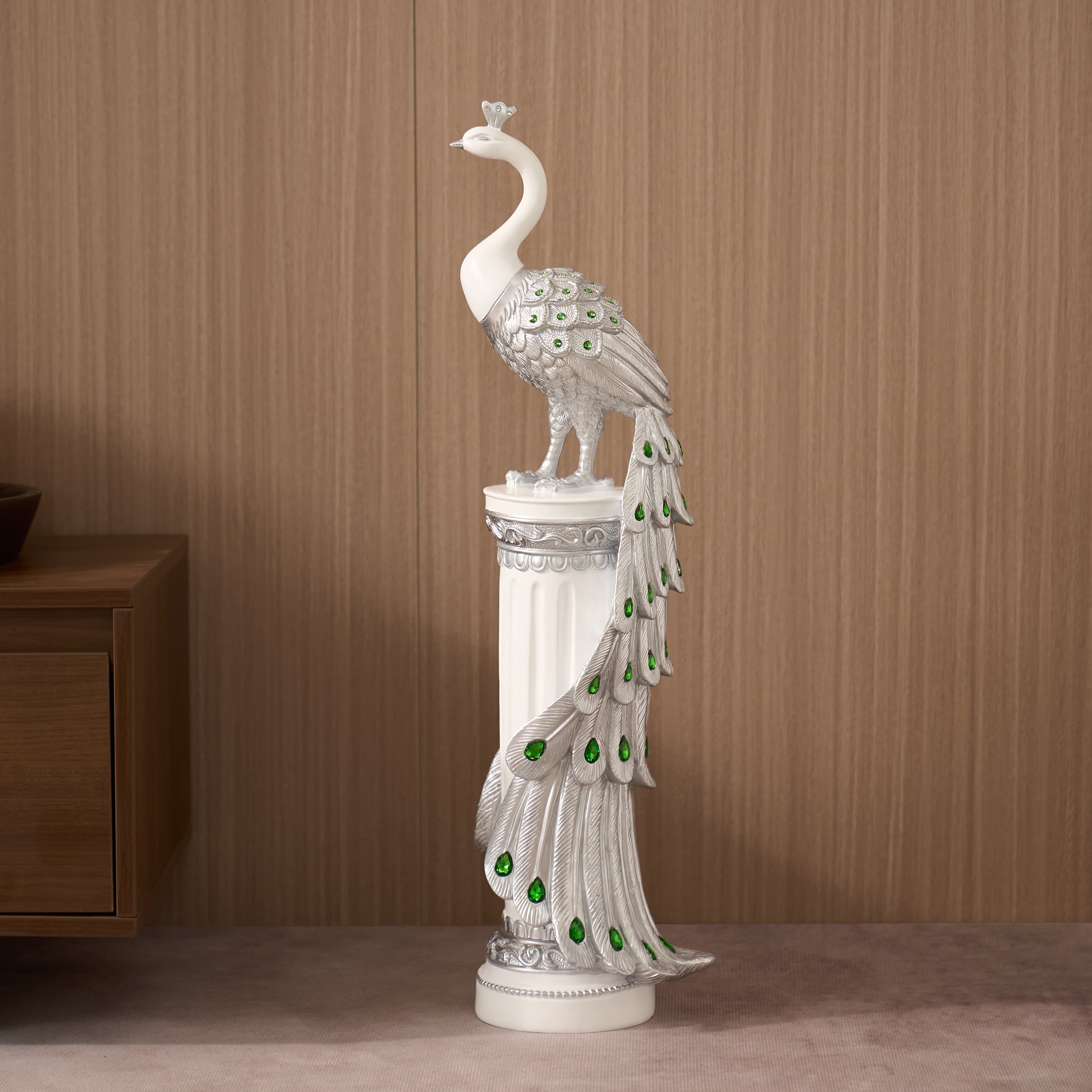 Elevate your interior with this stunning 27.6 inches Silver Peacock Sculpture, a statement piece designed to bring elegance, sophistication, and artistic charm into any space. Premium Resin Construction: Made from durable, high-quality resin for long-lasting beauty and structural integrity. Elegant Silver Finish: Sophisticated metallic silver tone complements modern, luxury, contemporary, and classic decor styles. Sparkling Diamond Accents: Embedded diamond details on feathers create brilliant reflections and a high-end decorative look. Lifelike Craftsmanship: Intricately sculpted feathers and graceful posture deliver realistic detailing and artistic elegance. Stable Pedestal Base: Designed with a sturdy base for enhanced balance and secure placement. Versatile Decorative Accent: Perfect for living room decor, entryway styling, office decoration, hotel lobby displays, and luxury interior spaces. Symbolic & Meaningful Gift: The peacock symbolizes beauty, prosperity, and good fortuneâideal for special occasions and celebrations.