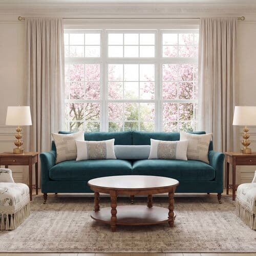 Introducing the Montclair 2-Seat Sofa, a sophisticated blend of tailored comfort and timeless design. Handmade in the USA, this sofa is crafted with a furniture-grade kiln-dried laminate hardwood frame for lasting durability and refined elegance. The sinuous spring seat deck is paired with plush cloud cushions, offering a relaxed, inviting sit with refined structure. Turned front legs fitted with classic brass casters add a traditional finishing touch and subtle mobility. Offered in two length options and finished with two 13" x 26" non-welted kidney pillows, the Montclair 2-Seat Sofa brings classic proportion and elevated craftsmanship to any living space.