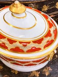 Decor just got sweeter with this antique Victorian era sugar bowl! A gold and red pattern with banding surrounds the lid and base. The vessel is an oval shape made of porcelain. Though originally made for sugar, this would serve well as a candy dish or small item storage. Most of all, it adds a bright pop of color and intrigue to any space!